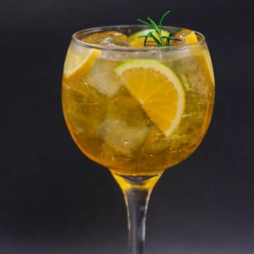Gin, tônica, ramo alegrim e pimenta rosa.
