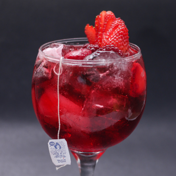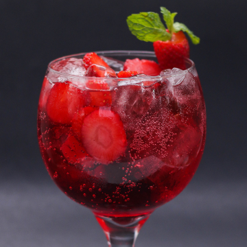Gin, morango, xarope de morango, suco cranberry e tônica.