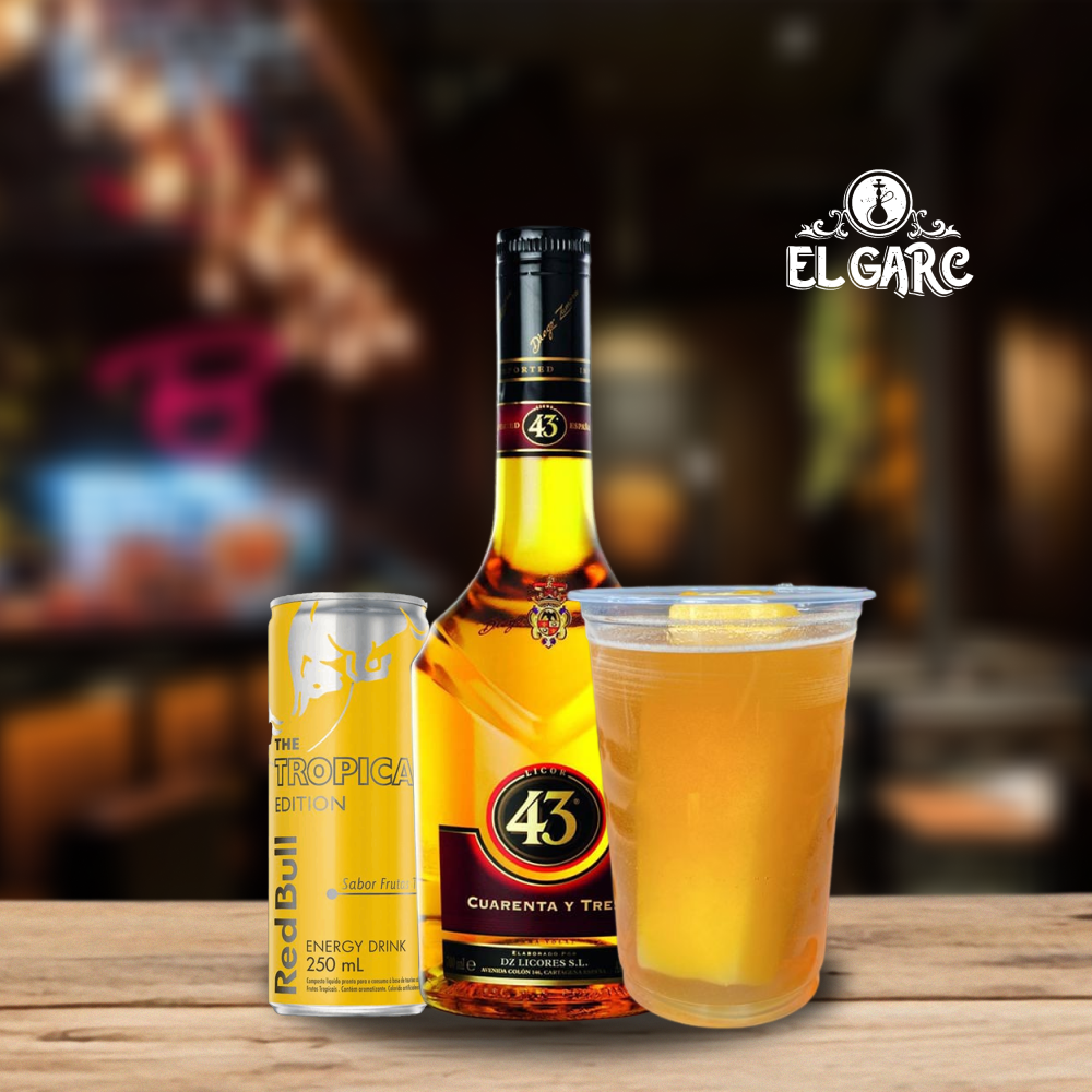 Licor 43, red bull tropical e gelo de coco.