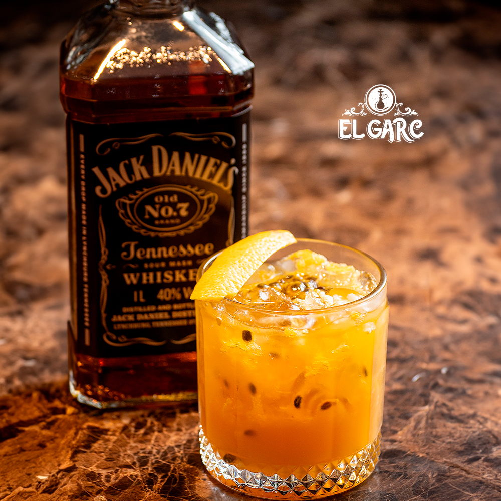 Whisky, maracujá, xarope, açúcar e schweppes citrus.